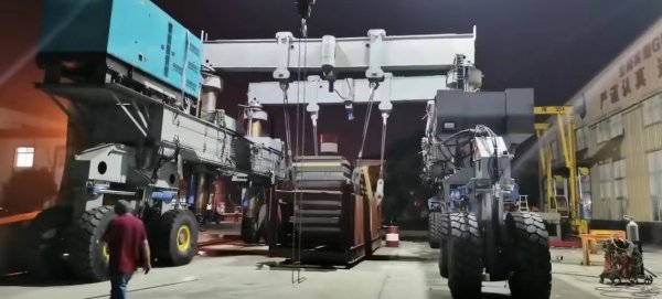 首先從外形上看,這款龍門吊屬于大型設(shè)備,客戶要的這款不是常規(guī)的液壓龍門吊,既可以行走,又可以折疊??待堥T吊上的輪胎,有16個(gè),輪胎的高度也是比較高的,整臺(tái)設(shè)備的整體高度高達(dá)4米多。