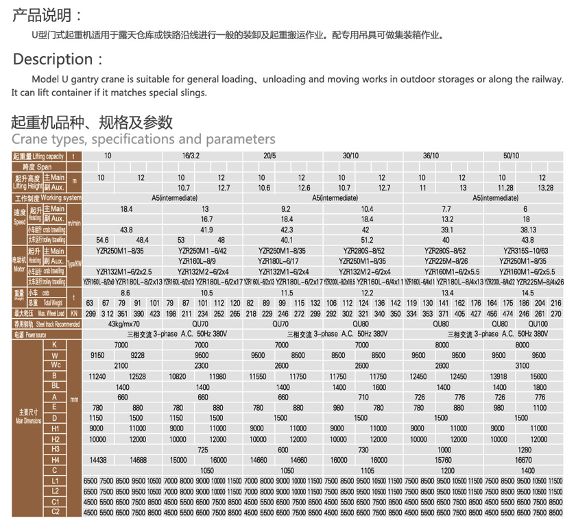 U型門式起重機適用于露天倉庫或鐵路沿線進(jìn)行一般的裝卸及起重搬運作業(yè)。配專用吊具可做集裝箱作業(yè)。